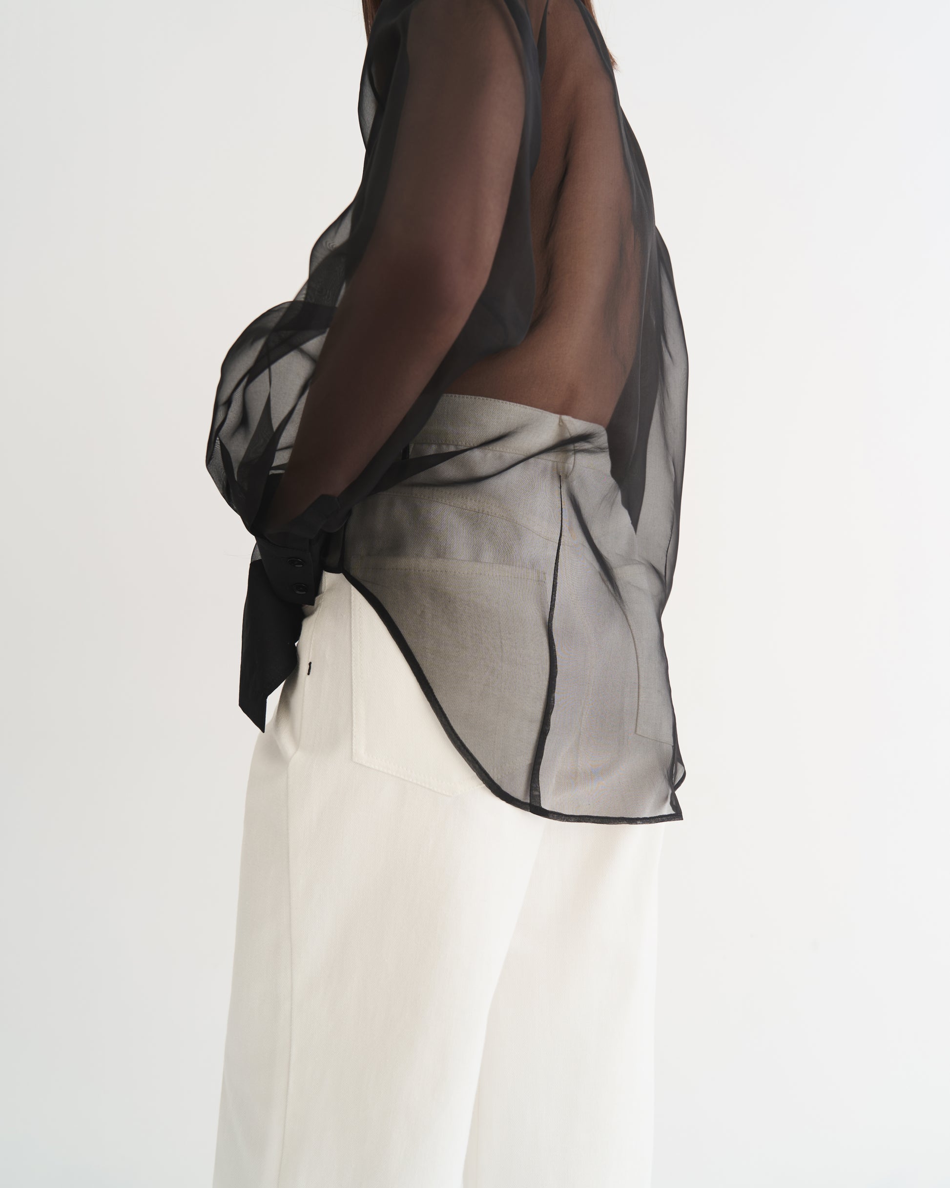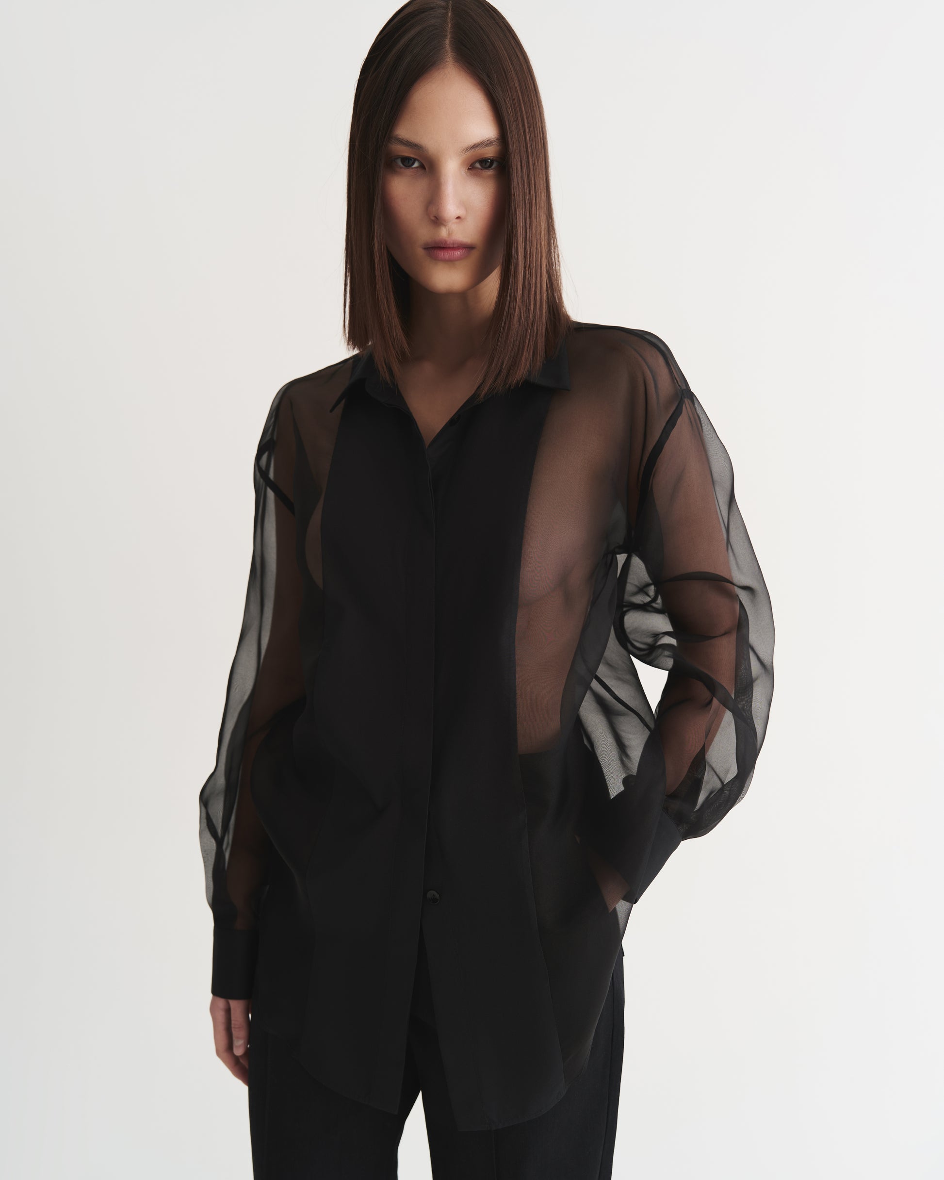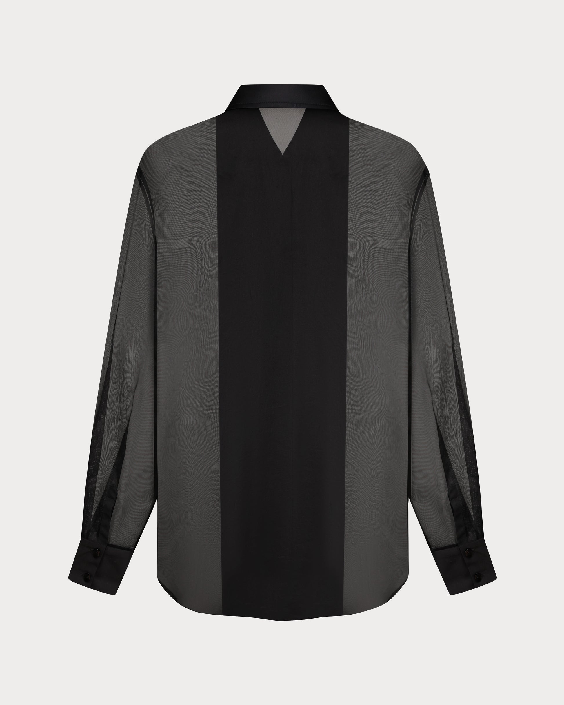 This black silk shirt crafted from organza, featuring cotton panels at the front and on the cuffs. Light and airy, it is detailed with natural mother-of-pearl buttons and delicate decorative twists at the back, adding a refined accent. Wear it effortlessly with jeans or tailored trousers.