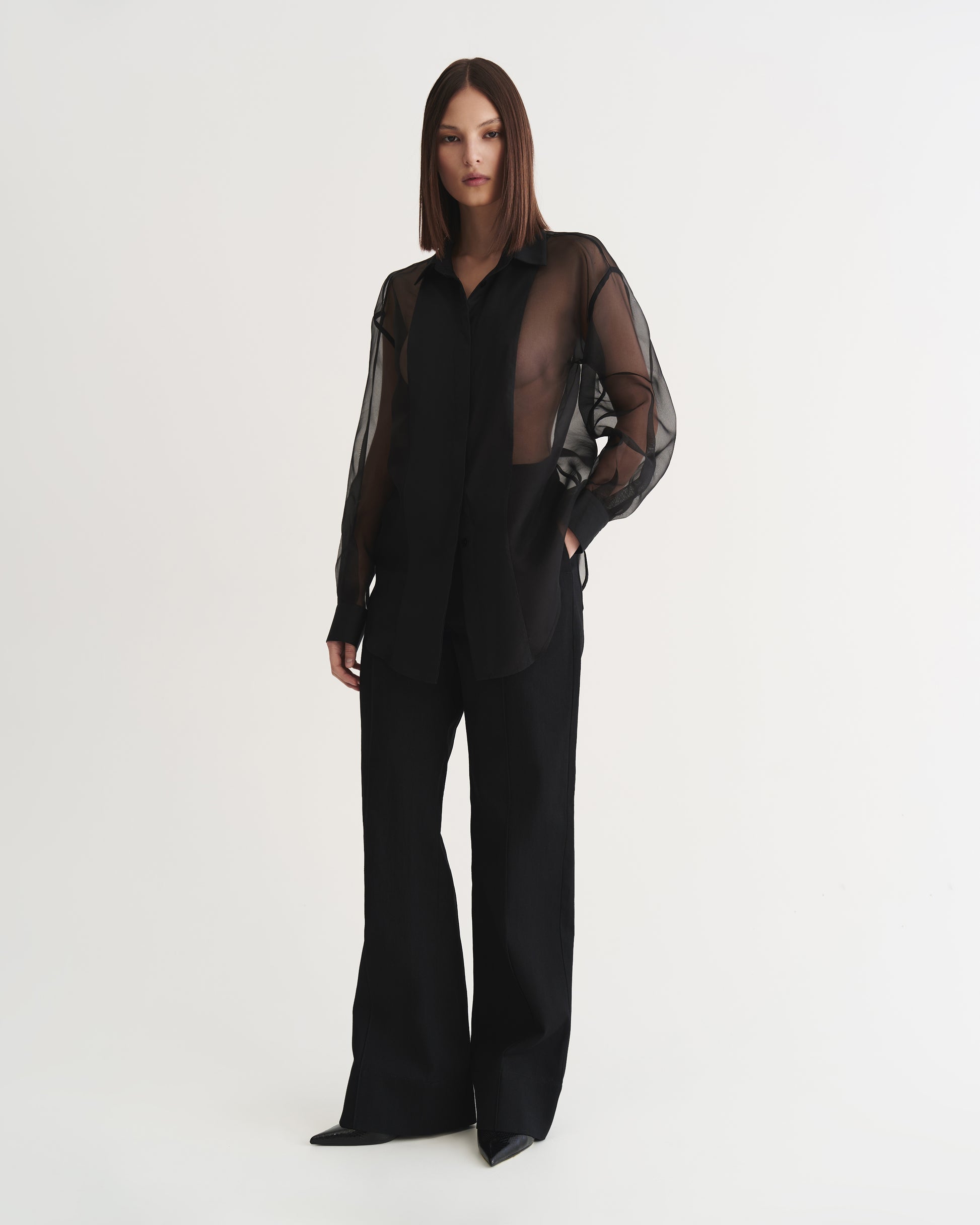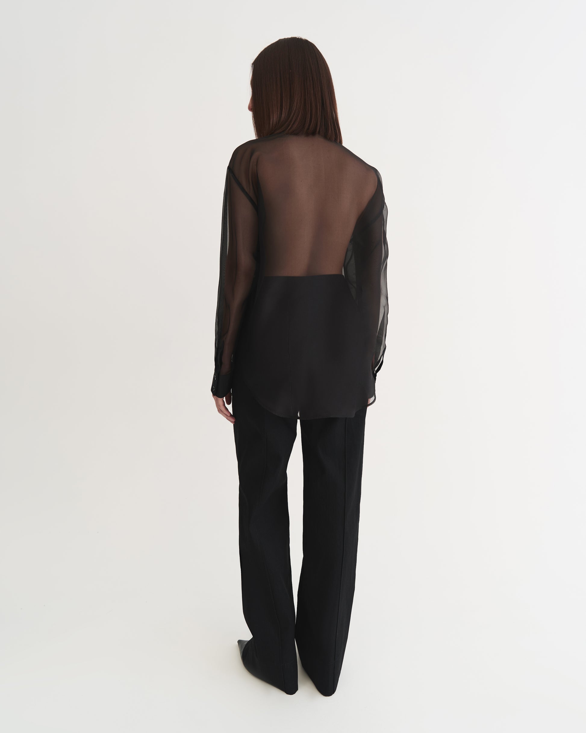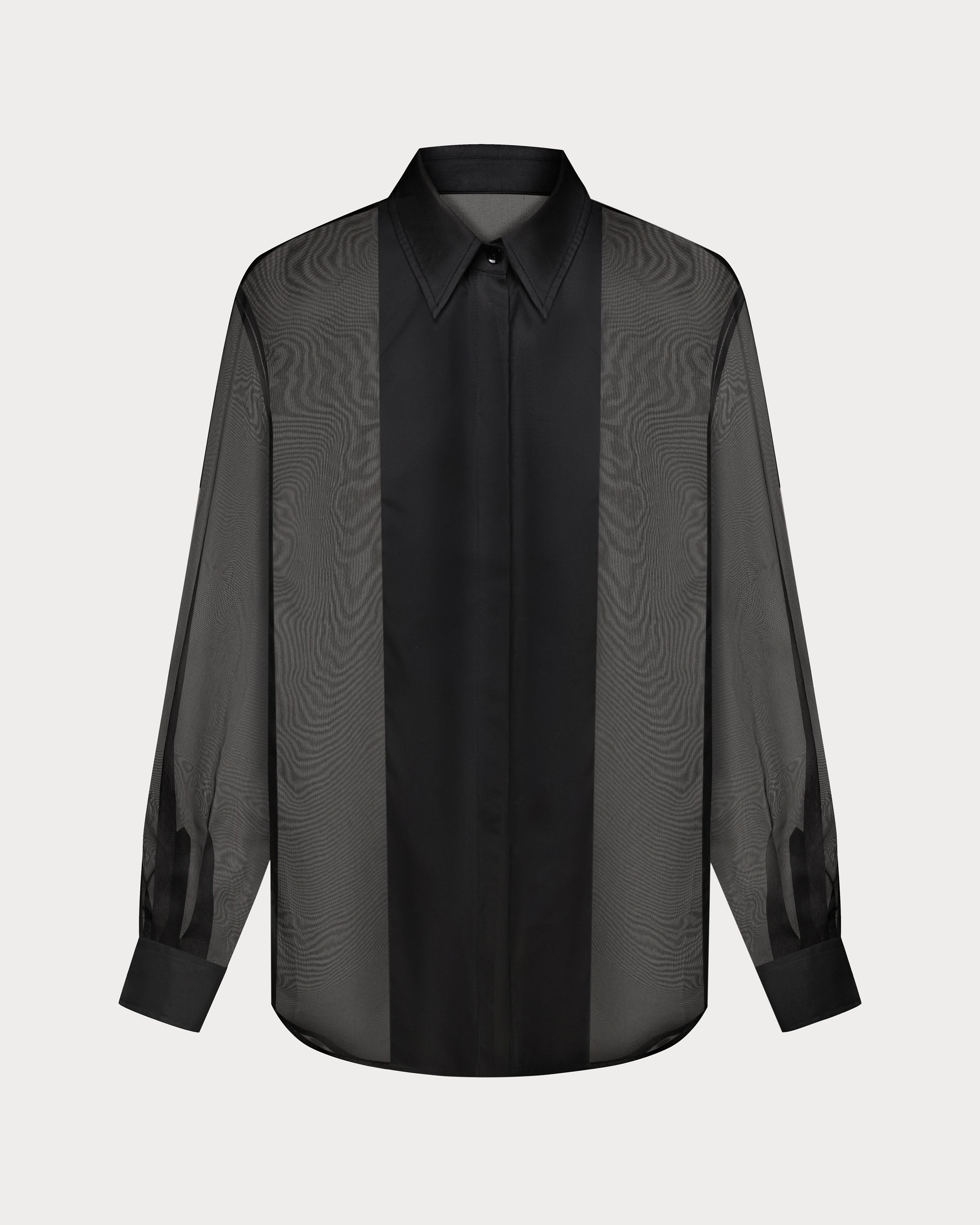 This black silk shirt crafted from organza, featuring cotton panels at the front and on the cuffs. Light and airy, it is detailed with natural mother-of-pearl buttons and delicate decorative twists at the back, adding a refined accent. Wear it effortlessly with jeans or tailored trousers.