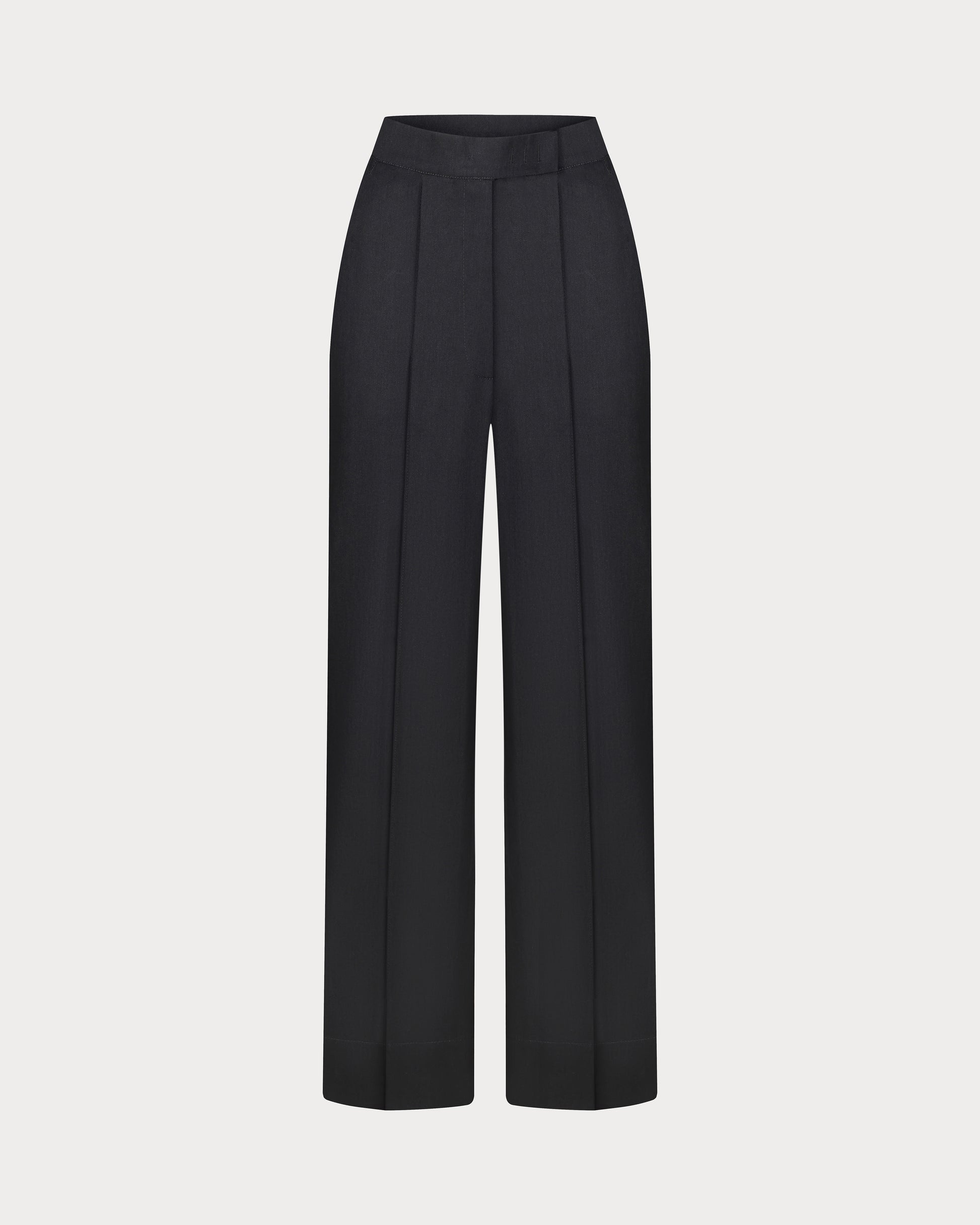 This black jeans in a classic cut with a clean, elongated line. A structured waistband adds definition, while a wide hem refines the lower edge with a composed finish. Subtle front creases introduce a neat vertical accent. Style with the CAELI jacket for a modern, fully resolved look.