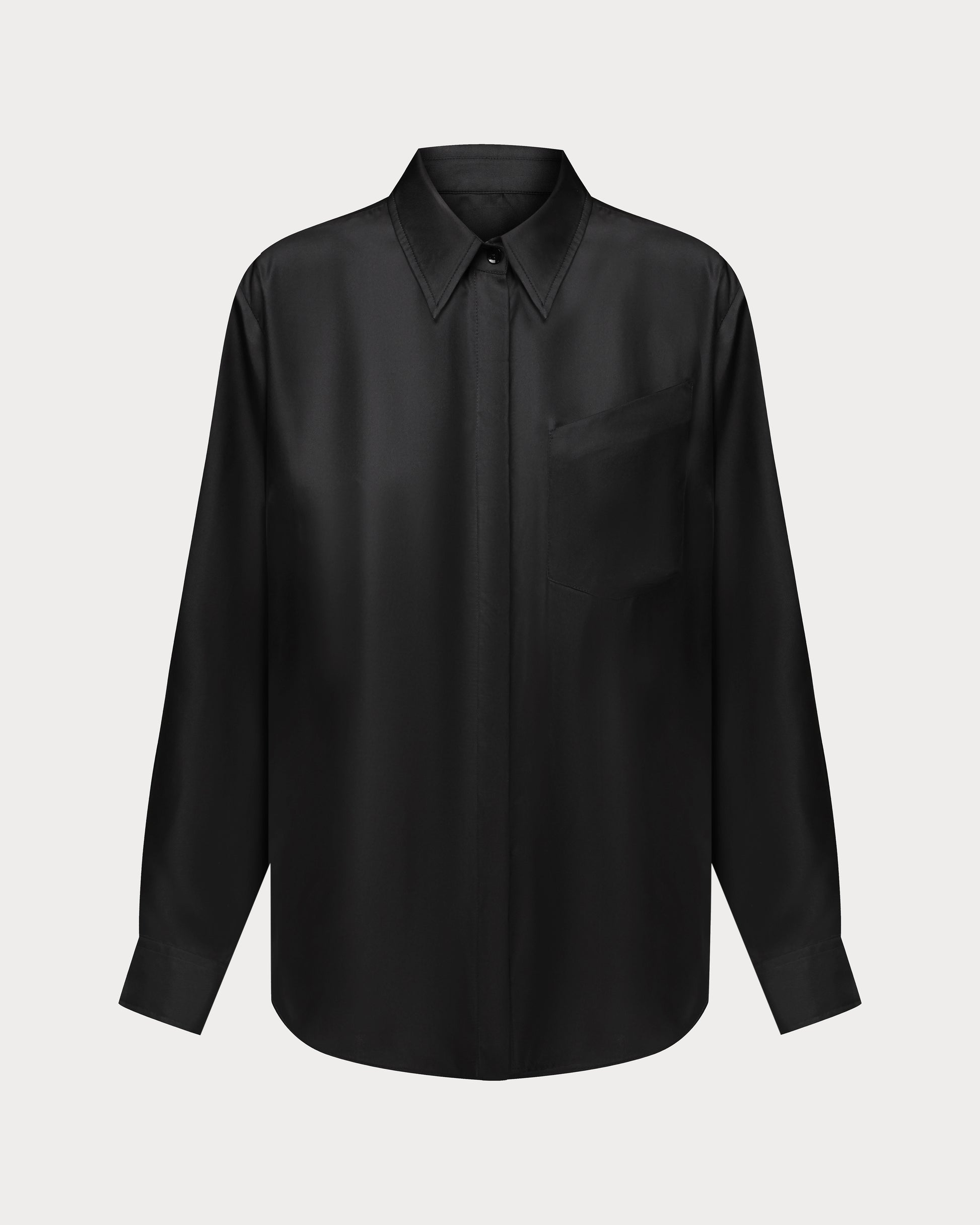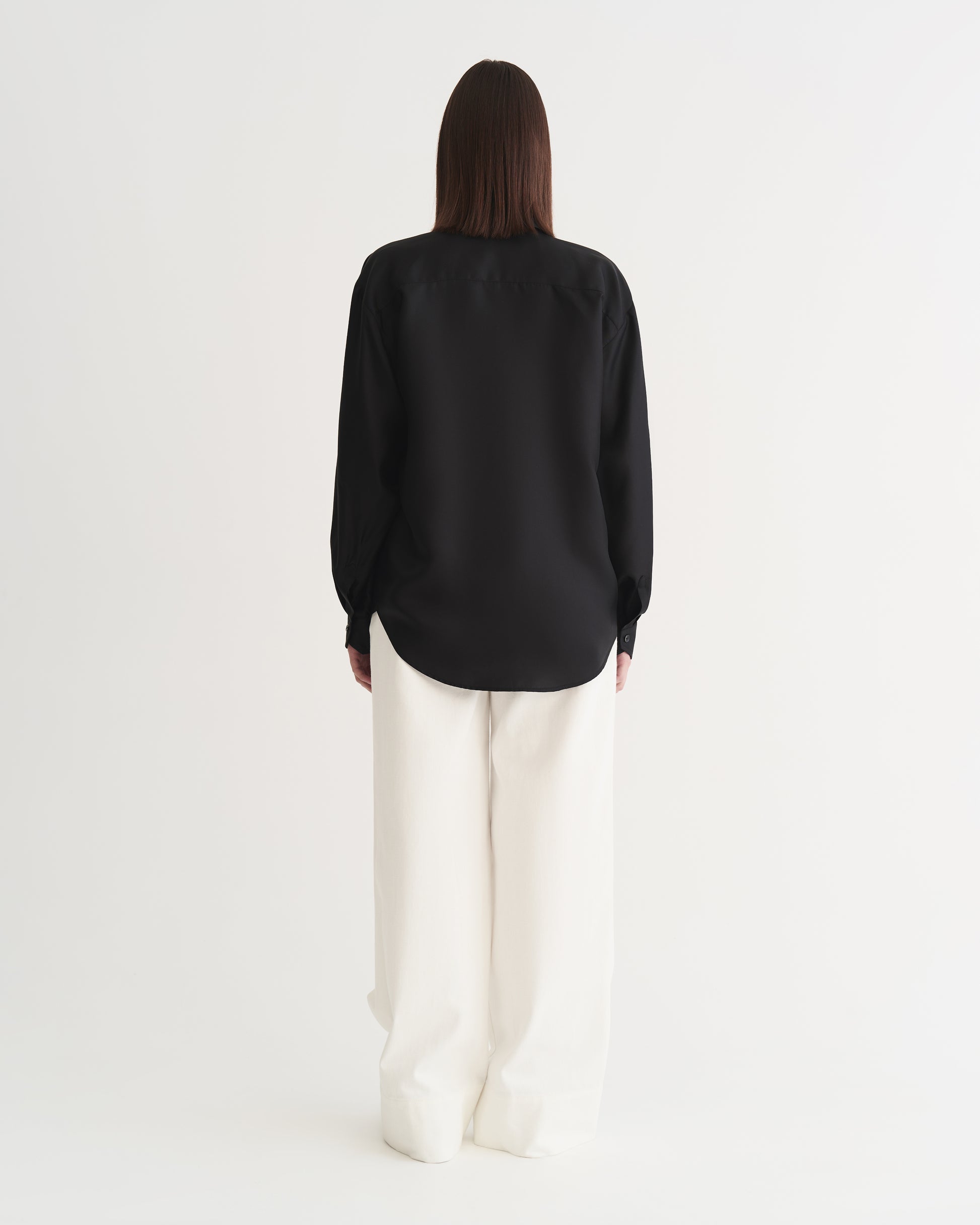 This black silk shirt crafted from natural twill silk, featuring a subtle lustre, an asymmetrical pocket, and genuine mother-of-pearl buttons. Lightweight and effortlessly comfortable, it drapes elegantly, retains its structure, and suits any occasion.